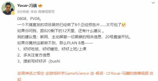游戏科学创始人、CEO皇冠信用网开号,《黑神话:悟空》制作人冯骥也第一时间发布微博,谈了谈游戏发售前的一些想法和建议,原文如下: