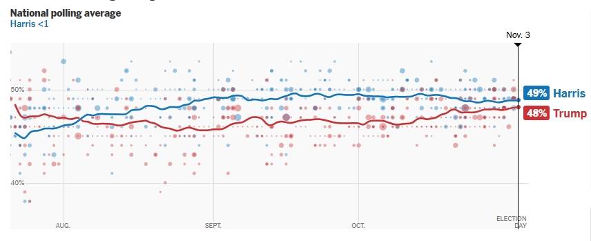 10月31日全国民调数据(蓝:哈里斯皇冠信用盘注册开通,红:特朗普)