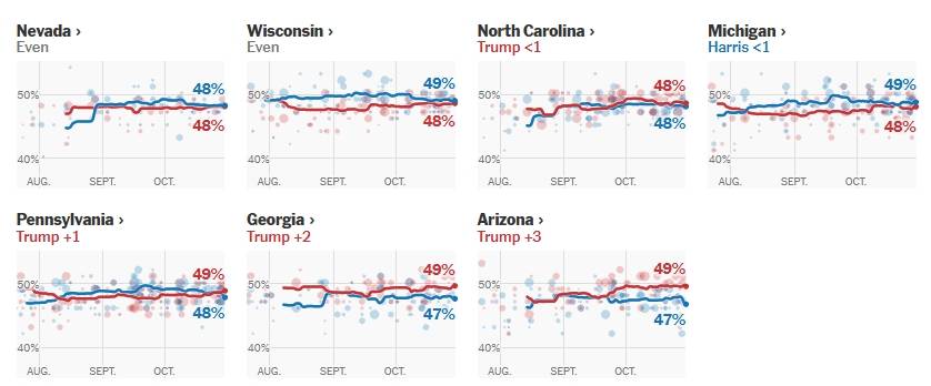 10月30日七大摇摆州的民调数据(蓝:哈里斯皇冠信用盘注册开通,红:特朗普)