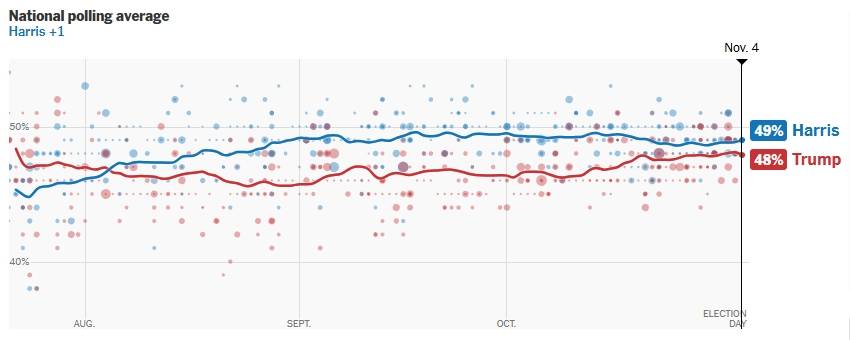 10月30日全国民调数据(蓝:哈里斯皇冠信用网在线申请,红:特朗普)
