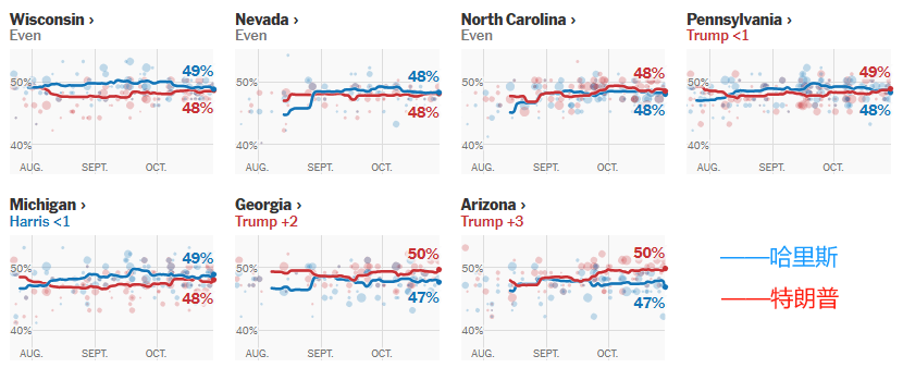 10月30日七大摇摆州的民调数据(蓝:哈里斯皇冠信用网在线申请,红:特朗普)