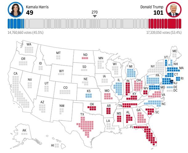 美国大选最新计票结果显示,共和党候选人、前总统特朗普赢得了肯塔基州(8张)和印第安纳州(11张),民主党候选人、副总统哈里斯赢得佛蒙特州(3张),目前两人19票对3票皇冠信用盘占成代理。美国总统选举实行选举人团制的间接选举制度,候选人需要获得至少270张选举人票才能当选。