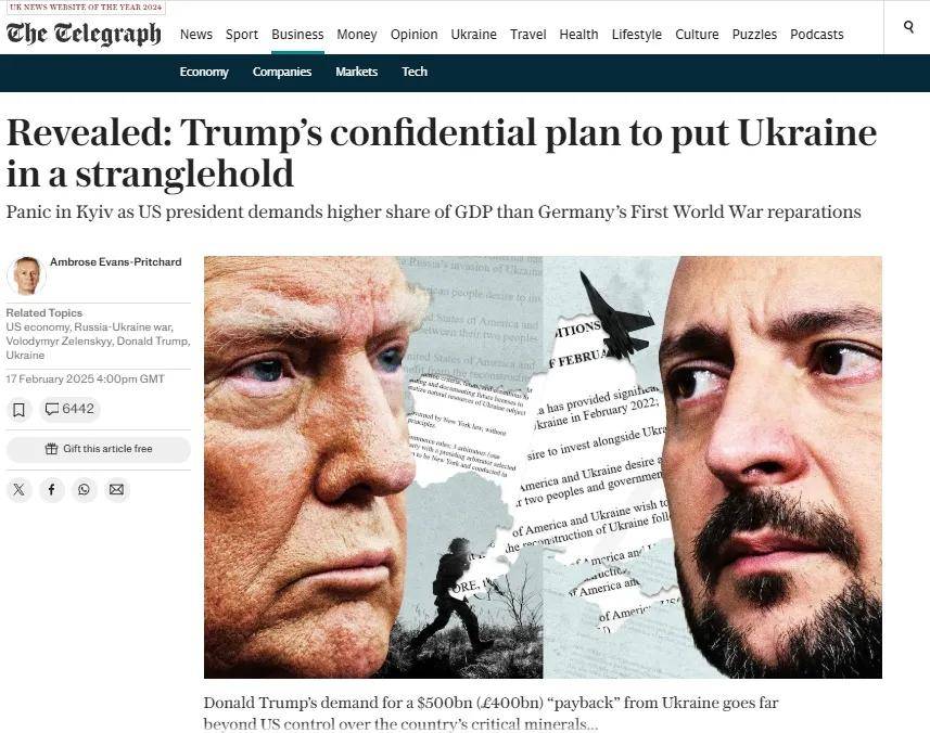 当然,好机会不好机会的,由不得美国说了算世界杯代理抽水。2月17日,英国大报《每日电讯报》大版面刊发了专栏作家安布罗斯·埃文斯·普理查德关于该协议的独家报道,报道的标题叫做《Trump’s confidential plan to put Ukraine in a stranglehold》——特朗普扼杀乌克兰的秘密计划。
