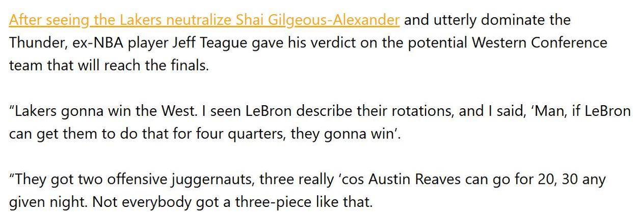 “洛杉矶湖人可以击败俄克拉荷马雷霆,他们也将夺得本赛季西部冠军!勒布朗描述了球队的阵容,若可以维持这般阵容打完整场比赛,那湖人可以夺得最终的胜利皇冠信用網会员申请网址 。”