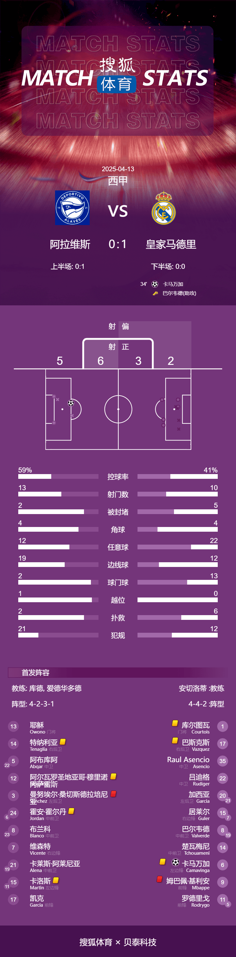 随后的10分钟的比赛,两支球队互有攻守,但是都没有形成有威胁的进攻机会皇冠信用網正网 。第34分钟,居勒尔右路传球,卡马文加接球和巴尔韦德撞了个墙,弧顶位置左脚远射轰出世界波,皮球入网,皇马1-0领先阿拉维斯。第38分钟,姆巴佩直接亮鞋钉踢在了布兰科的小腿侧面,吃到黄牌,而此时VAR裁判介入,主裁到场边观看视频回放后直接将姆巴佩出示红牌。第42分钟,约尔丹踢倒了罗德里戈,被黄牌警告。上半场比赛结束,皇马在客场1-0领先阿拉维斯。
