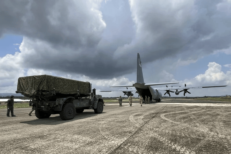 4月26日,在美菲年度“肩并肩”演习中,美军反舰系统的一部分,装载在一架美国C130军用飞机上皇冠信用网出租足球 。(图源:美联社)