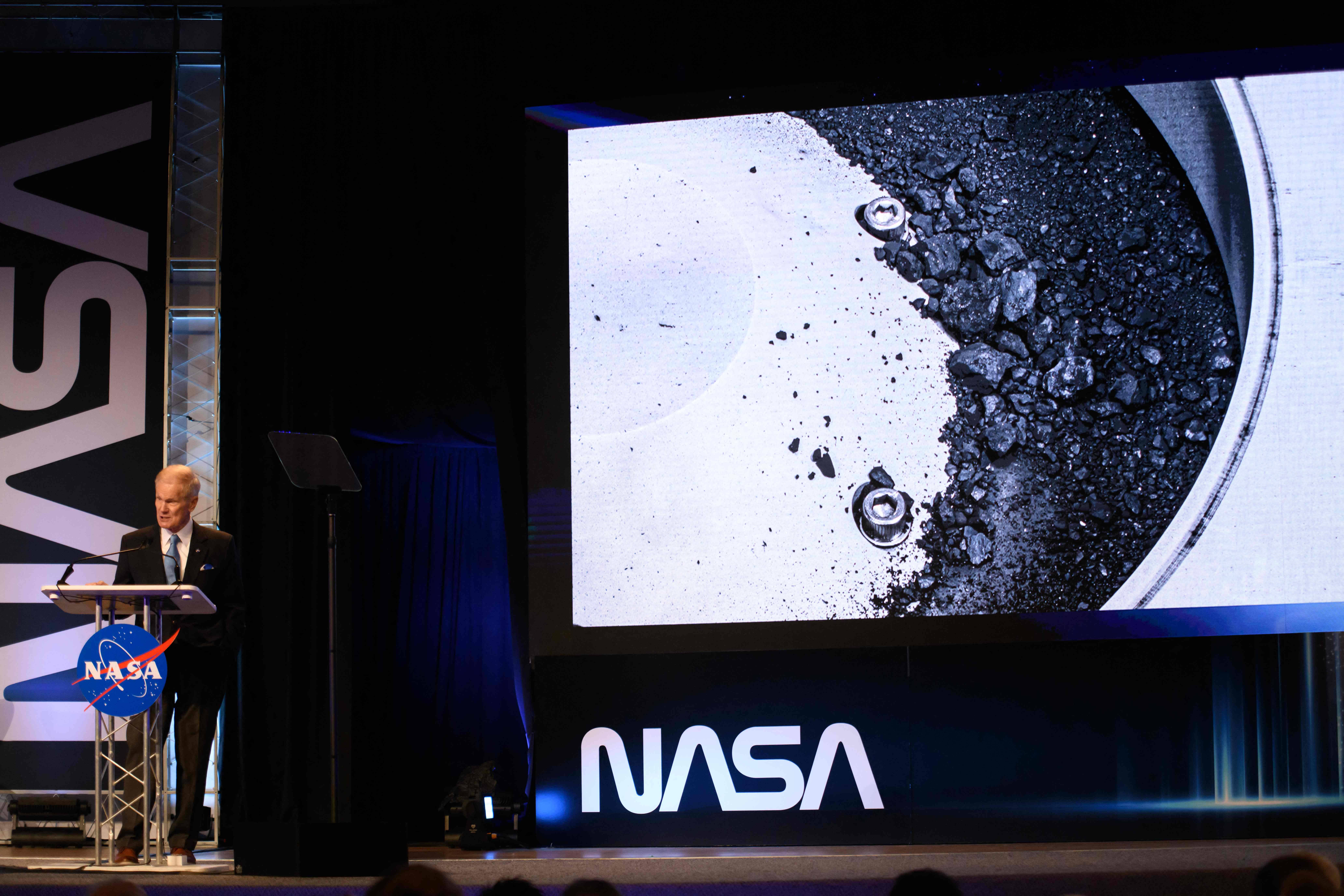 2023年10月11日,在美国休斯敦约翰逊航天中心,美国国家航空航天局首次向公众展示从小行星贝努采集到的样本的图片和视频皇冠信用网开户 。新华社/法新