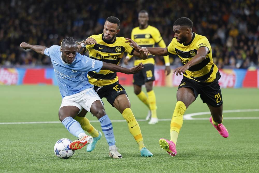 10月25日,曼彻斯特城队球员多库(左)与伯尔尼年轻人队球员加西亚(右)、埃利亚(中)拼抢年轻人足球。