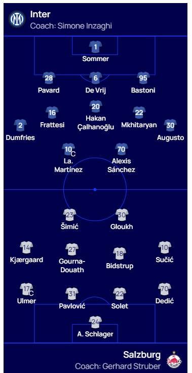 国米首发:1-索默、28-帕瓦尔、6-德弗里、95-巴斯托尼、2-邓弗里斯、16-弗拉泰西、20-恰尔汗奥卢、22-姆希塔良、30-奥古斯托、10-劳塔罗、70-桑切斯