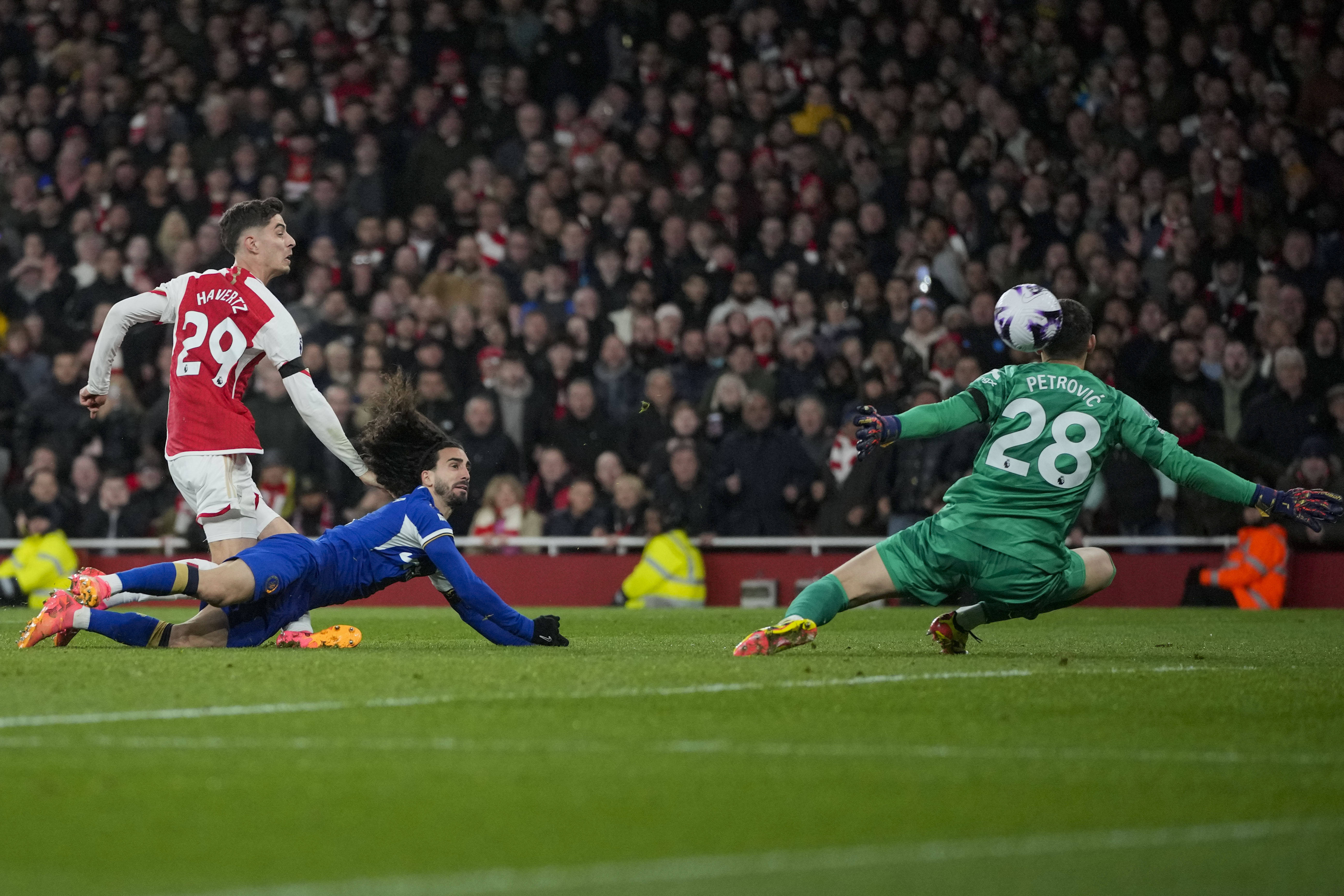 4月23日,阿森纳队球员哈弗茨(左)射门得分阿森纳足球直播。