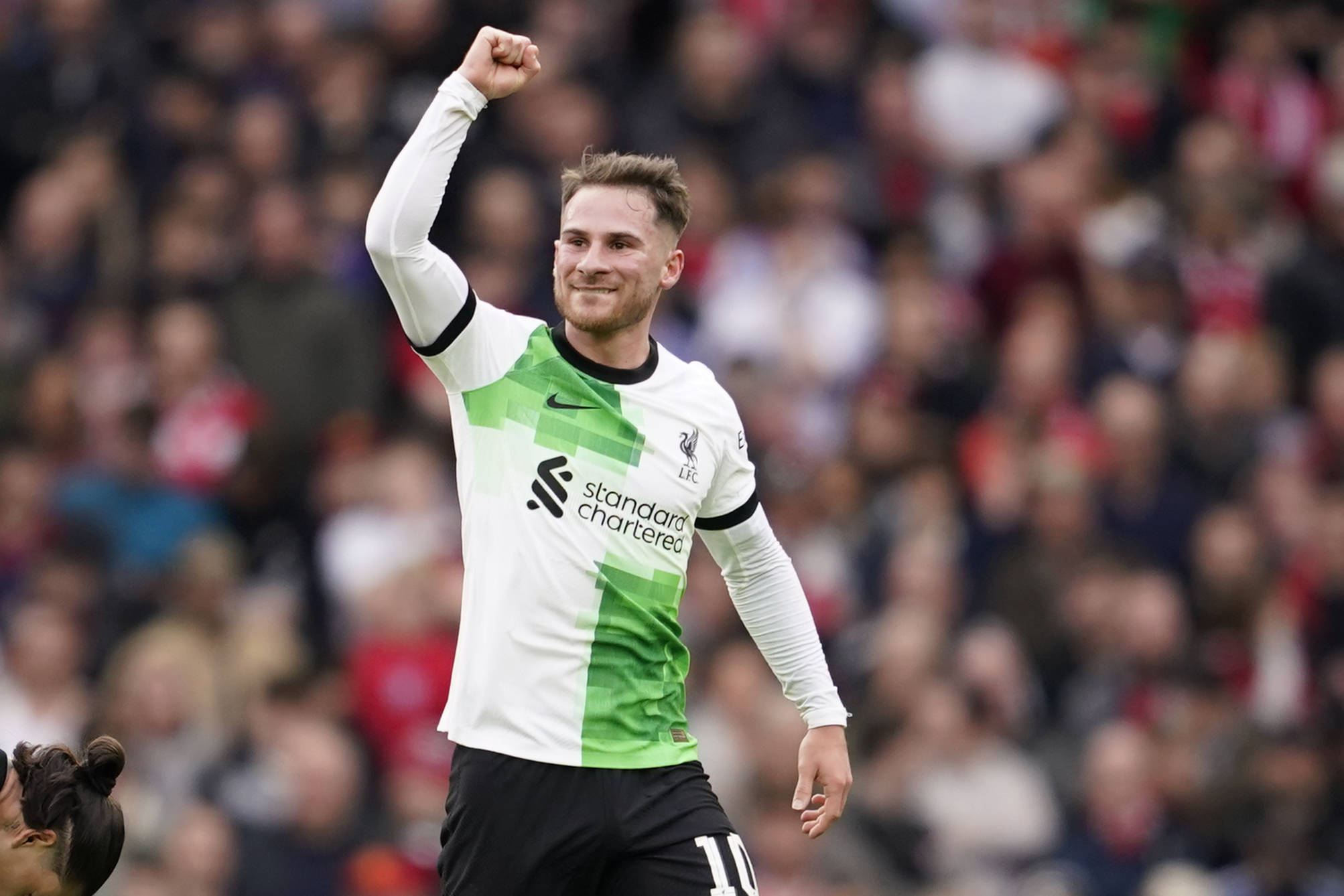 3月17日,利物浦队球员麦卡利斯特(左)攻入球队首球英格兰足总杯。