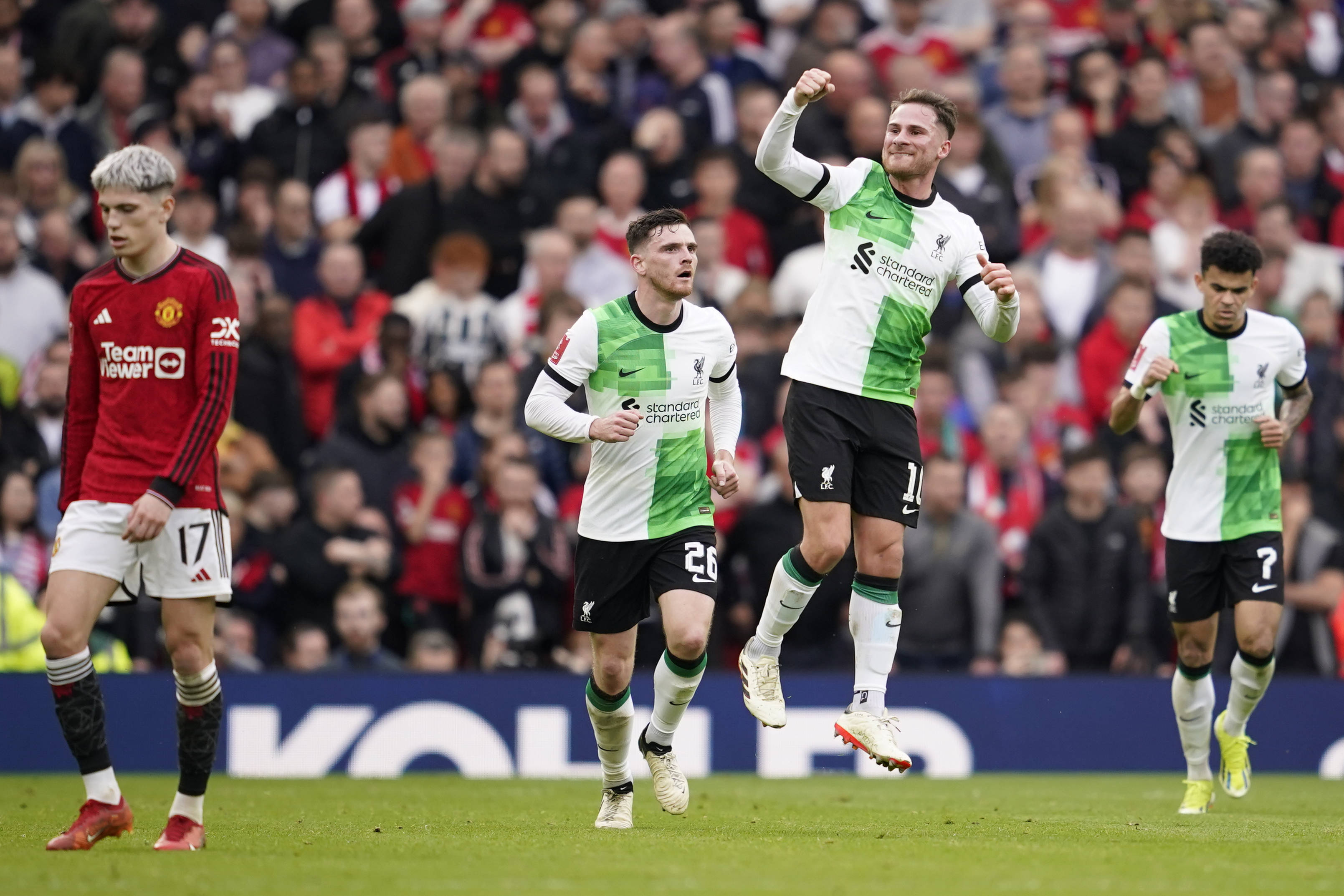 3月17日,利物浦队球员麦卡利斯特(右)攻入球队首球英格兰足总杯。